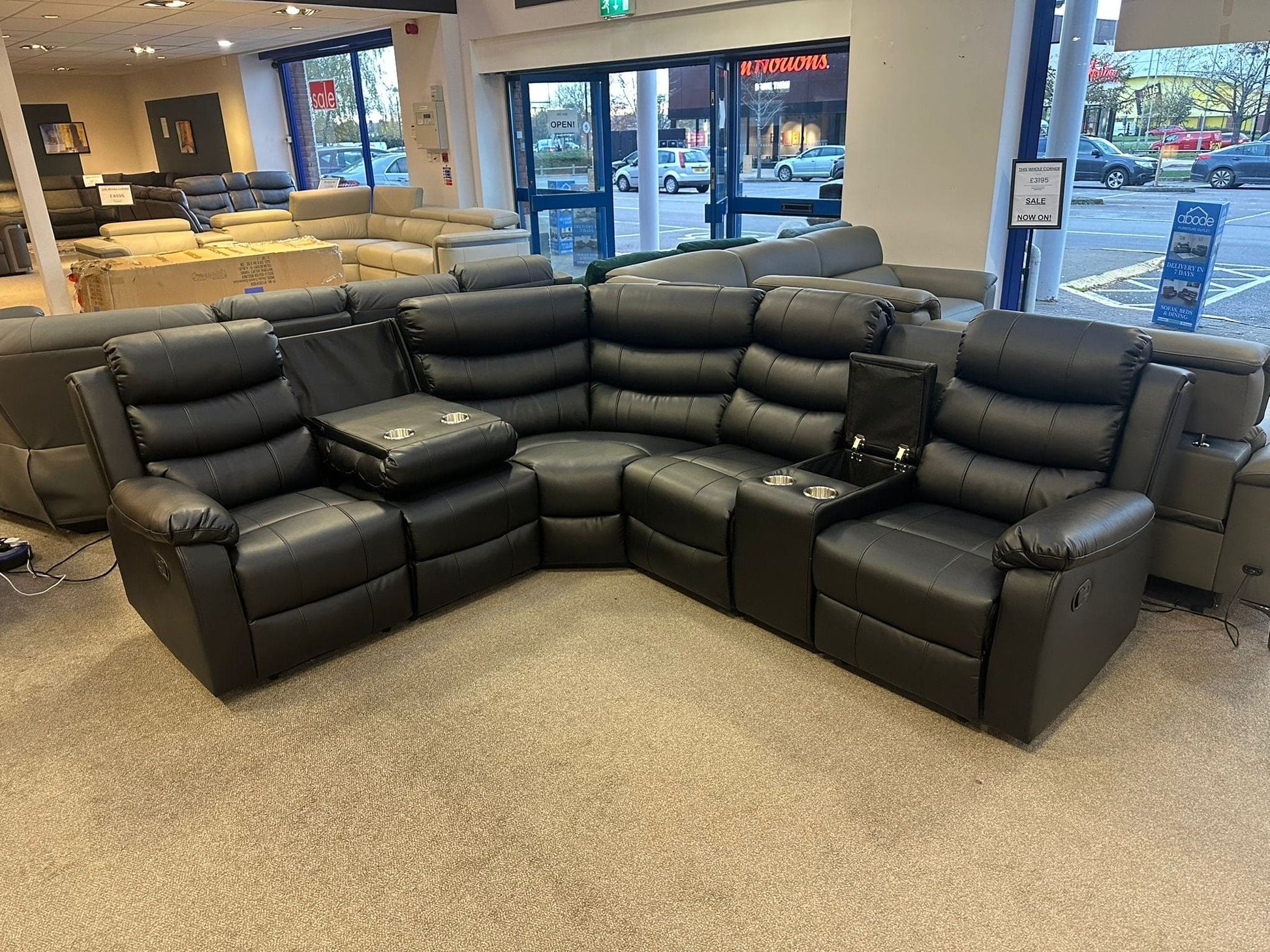 "Lando" Grey Leather 3C3C Recliner Corner Sofa Reversible | Drinks Tray Table | Modular