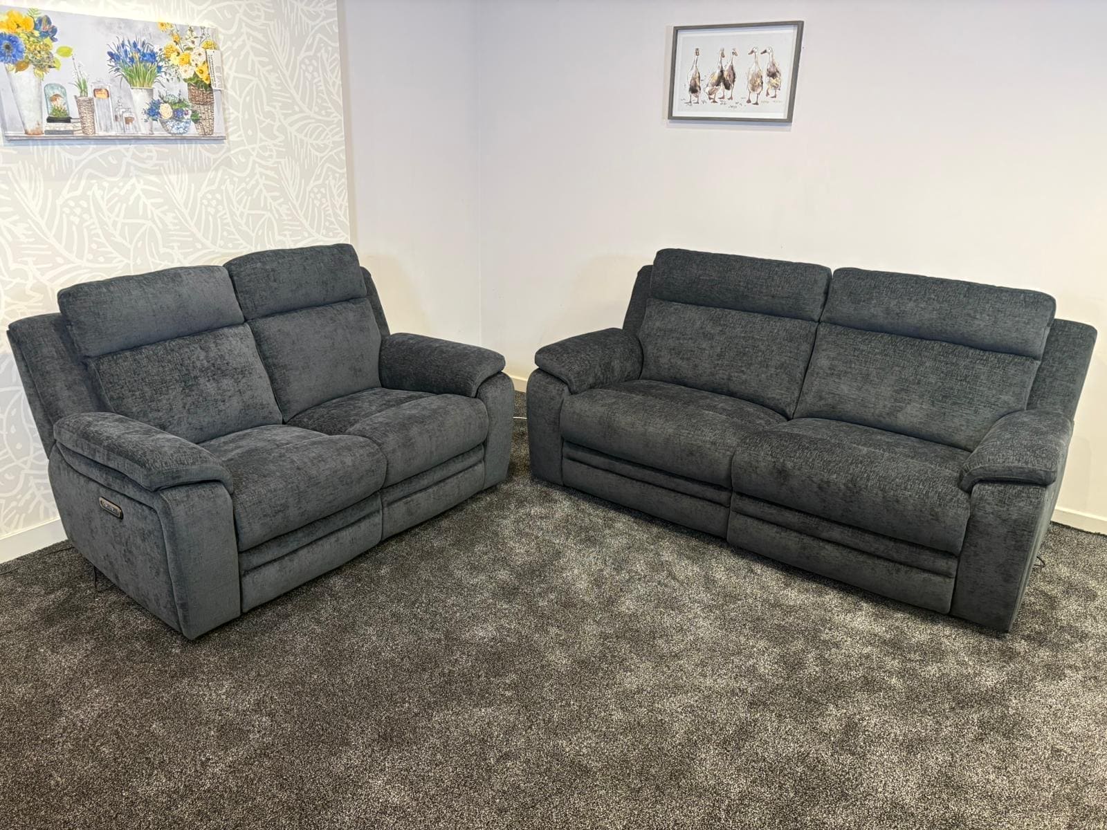 “Donald" Electric Reclining Charcoal Grey Fabric 3 Seater + 2 Seater Sofa Set - Drinks Coolers - USB Charging & Drinks Tray Table + High Seating & Backrest Position | Couch |