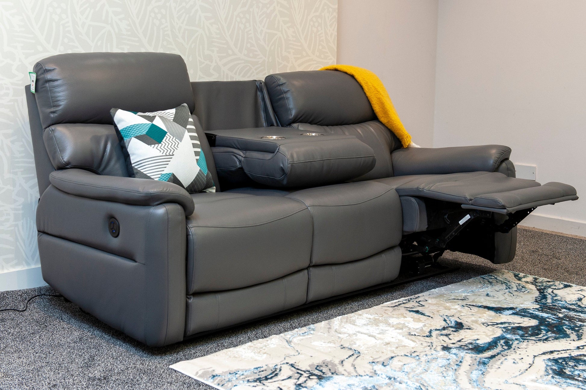 Donald Grey Leather Electric / Power Reclining 3 Seater + 2 Seater Sofa Suite Set With Drinks Coolers USB Charging Ports & Drop Down Tray Table