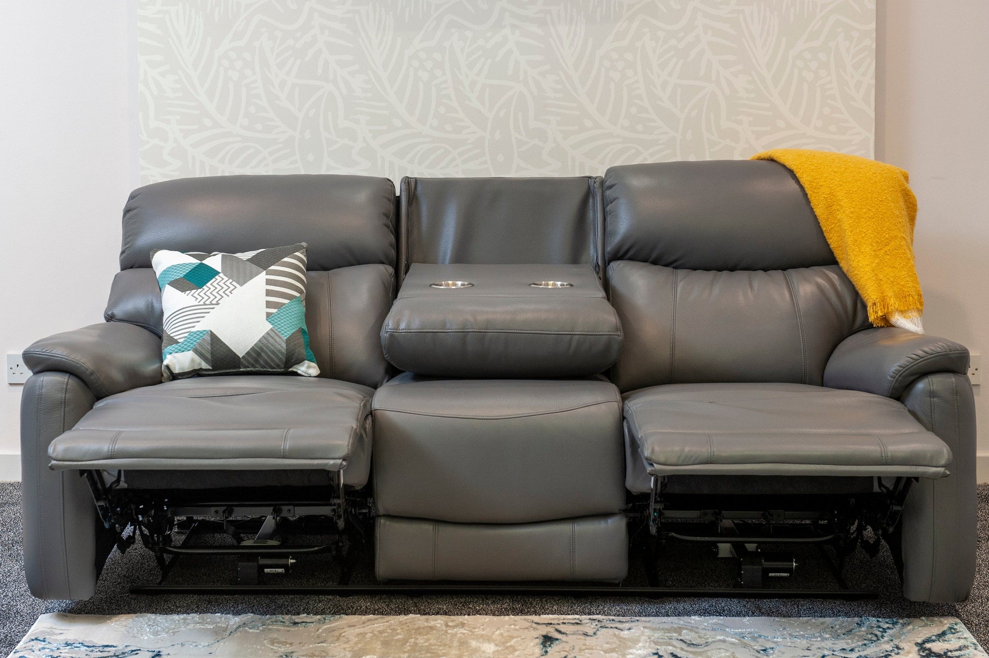 Lando Grey Leather 3 + 2 Seater Reclining Sofa Set With Drinks Tray Table Plus A High Backrest & Seating Position | Couch |