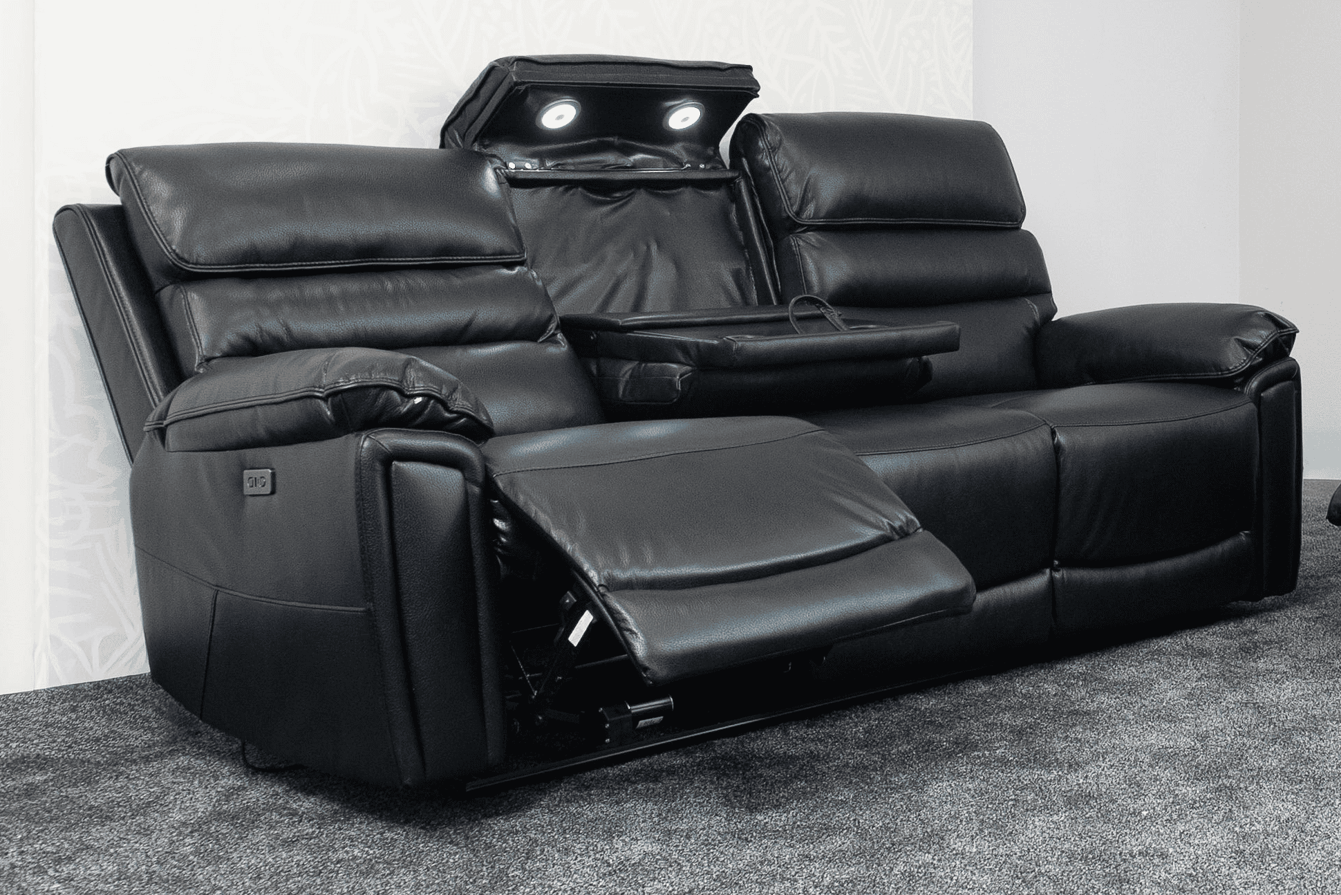 Donald Black Leather Electric / Power Reclining 3 Seater Sofa With USB Charging Ports & Drop Down Tray Table
