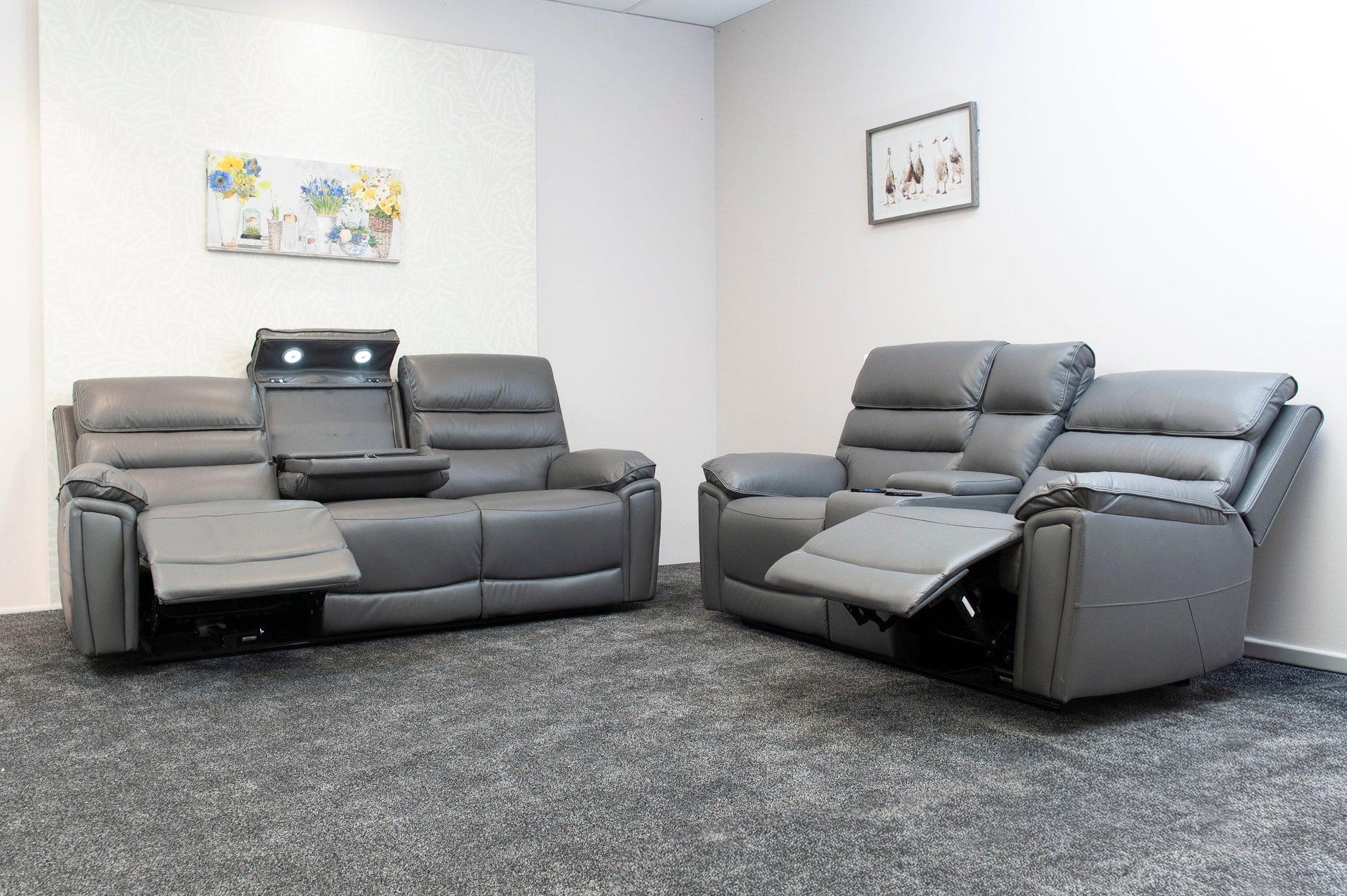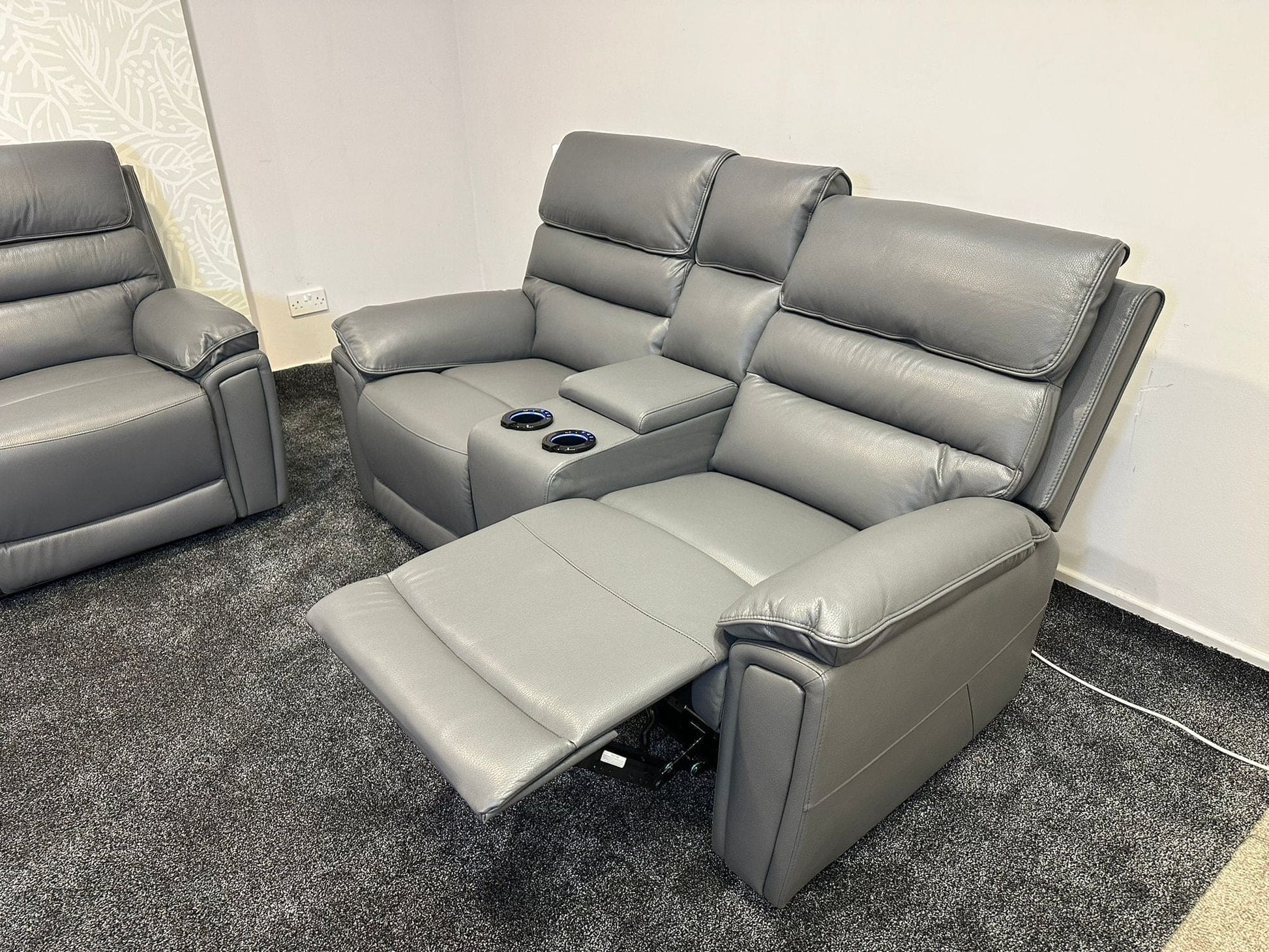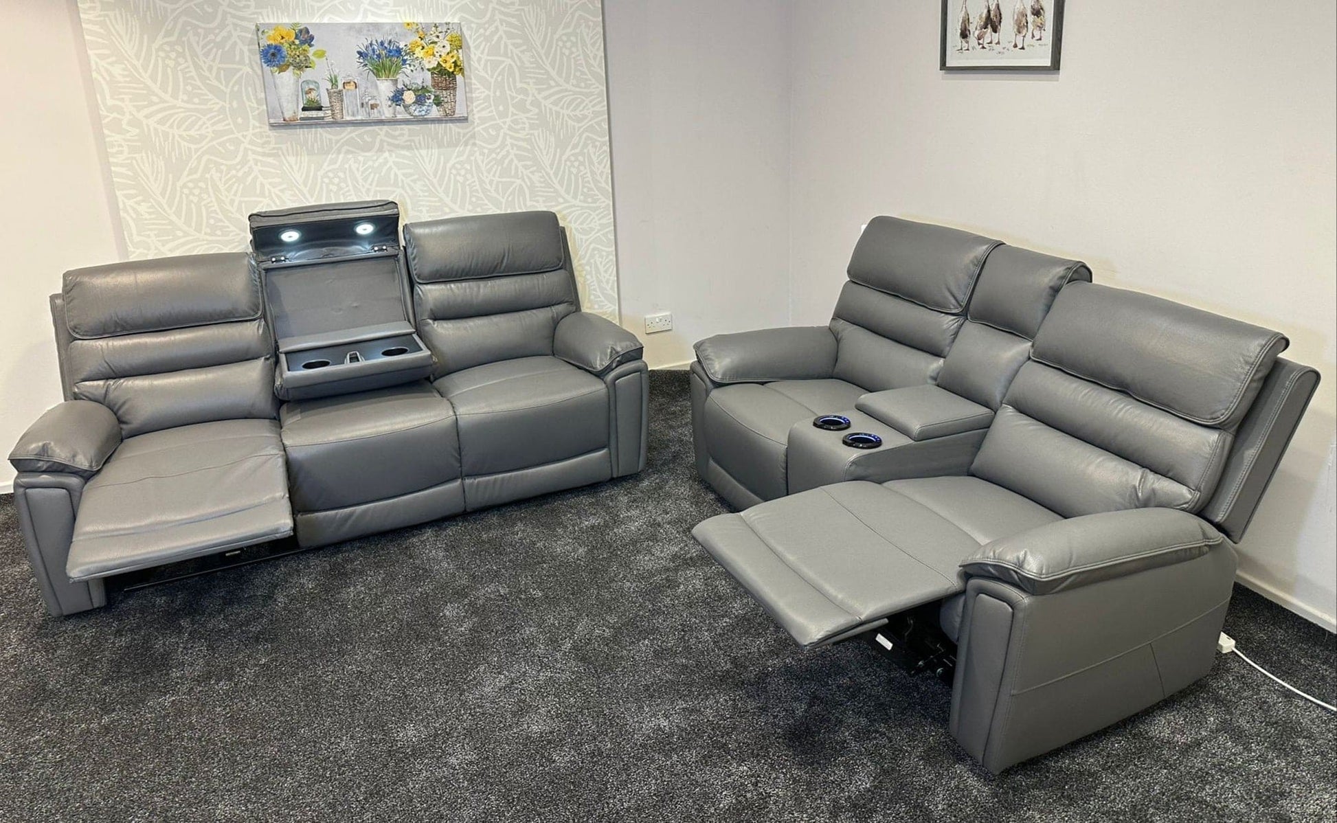 Donald Grey Leather Electric / Power Reclining 3 Seater + 2 Seater Sofa Suite Set With Drinks Coolers USB Charging Ports & Drop Down Tray Table