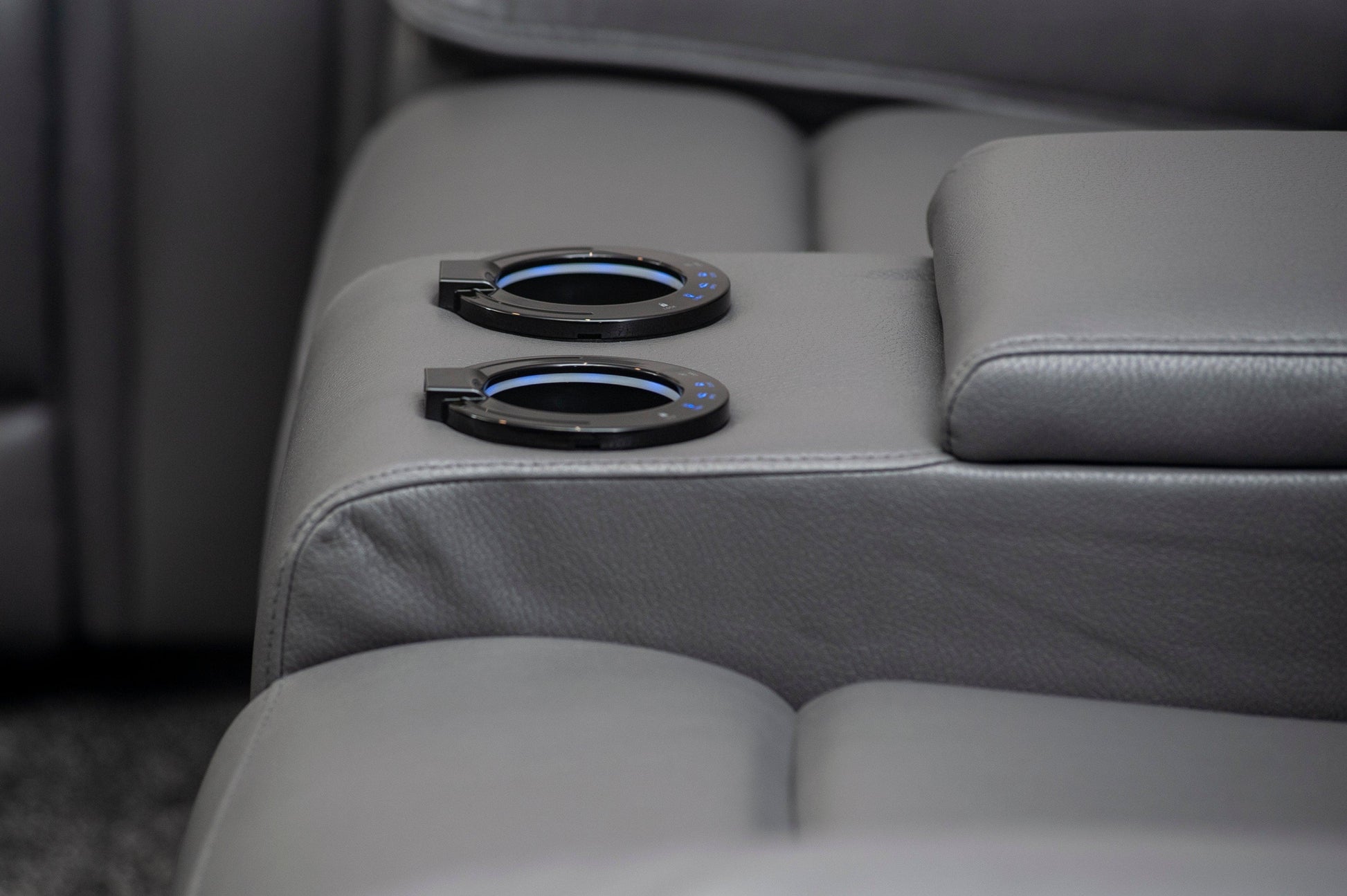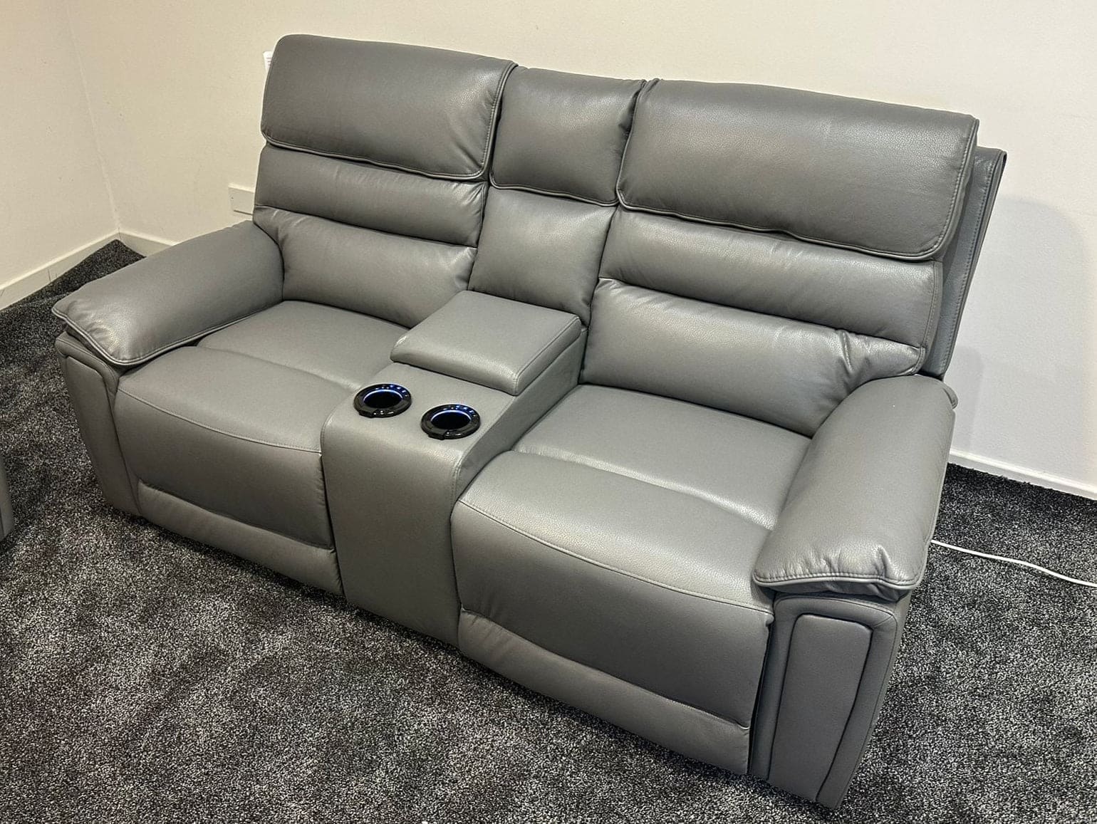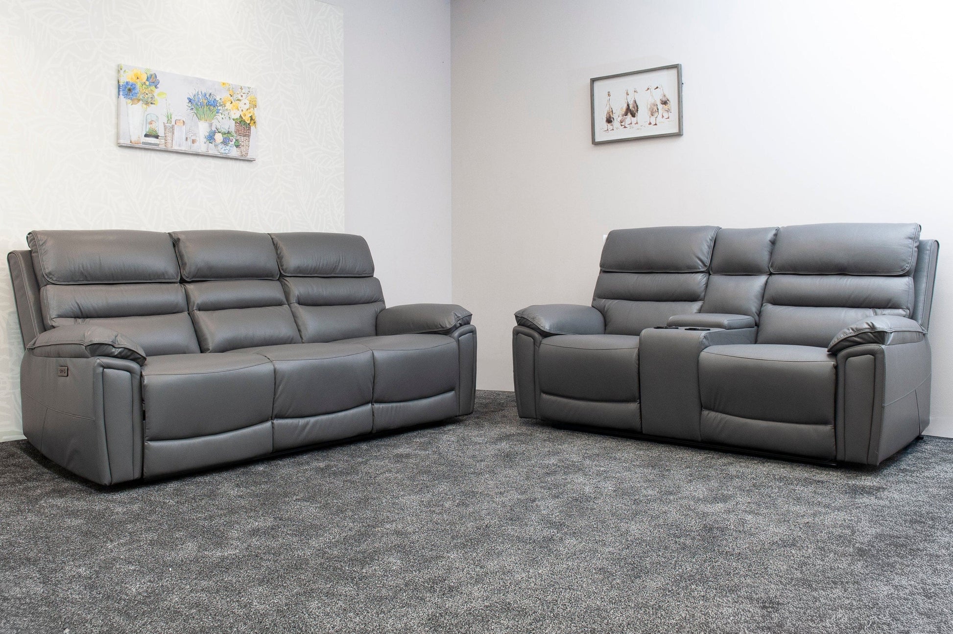 Donald Grey Leather Electric / Power Reclining 3 Seater + 2 Seater Sofa Suite Set With Drinks Coolers USB Charging Ports & Drop Down Tray Table