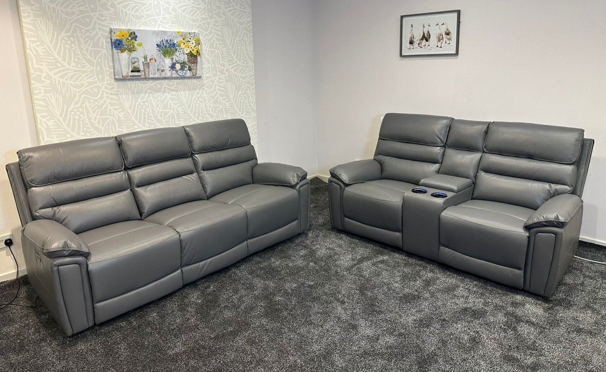 Lando Grey Leather 3 + 2 Seater Reclining Sofa Set With Drinks Tray Table Plus A High Backrest & Seating Position | Couch |