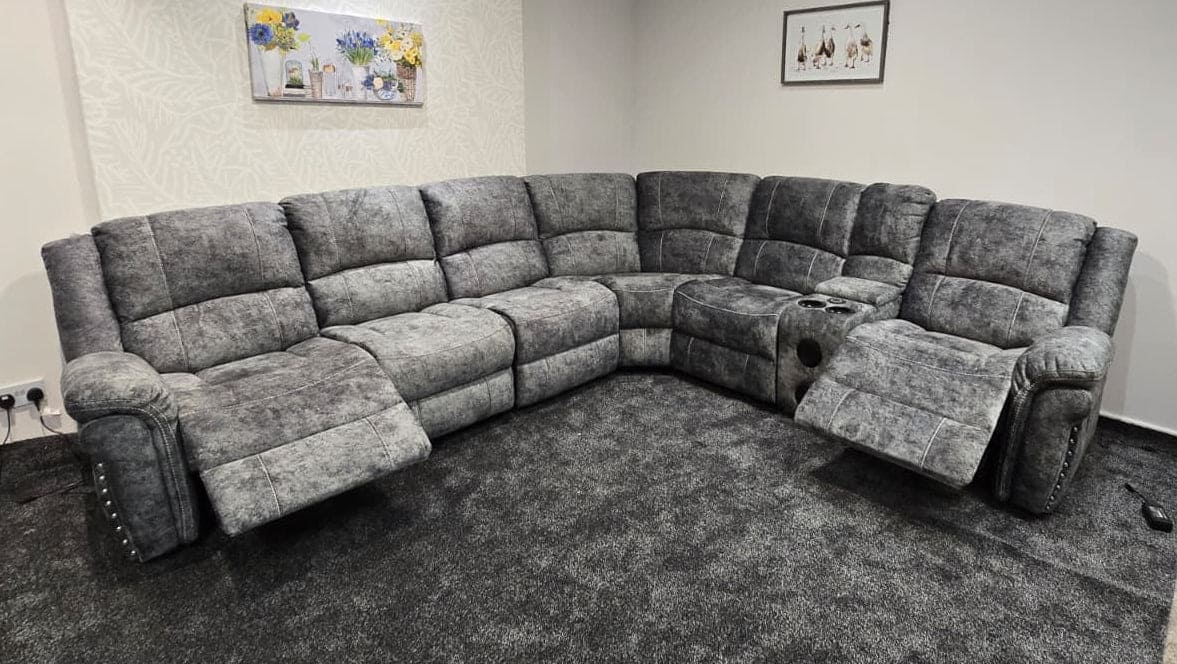 " Ronan " Grey Plush Velvet Fabric Electric Recliner - High Backrest & Seating Position Corner Sofa With USB Charing Ports + Drinks Console | Couch |