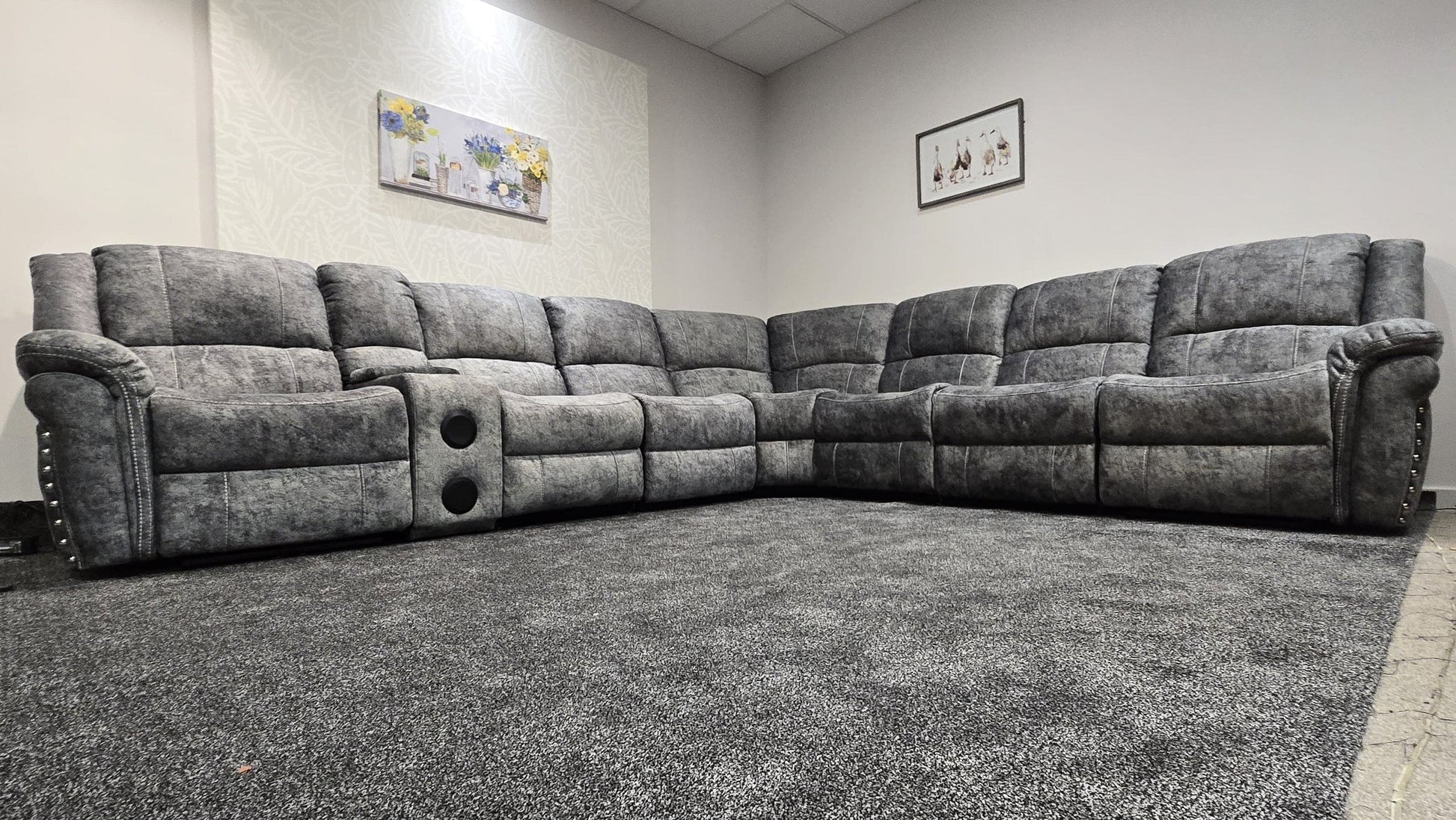 " Ronan " Grey Plush Velvet Fabric Electric Recliner - High Backrest & Seating Position Corner Sofa With USB Charing Ports + Drinks Console | Couch |