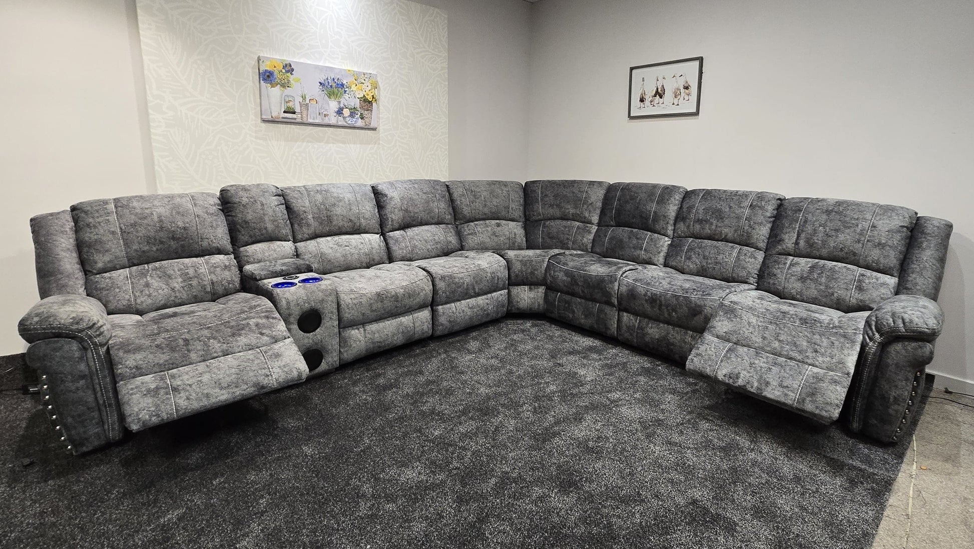 GALAXY "Finsbury Express" Grey Plush Velvet Electric Reclining Left & Right Hand Facing Modular Corner Sofa | USB Ports | Drinks Console