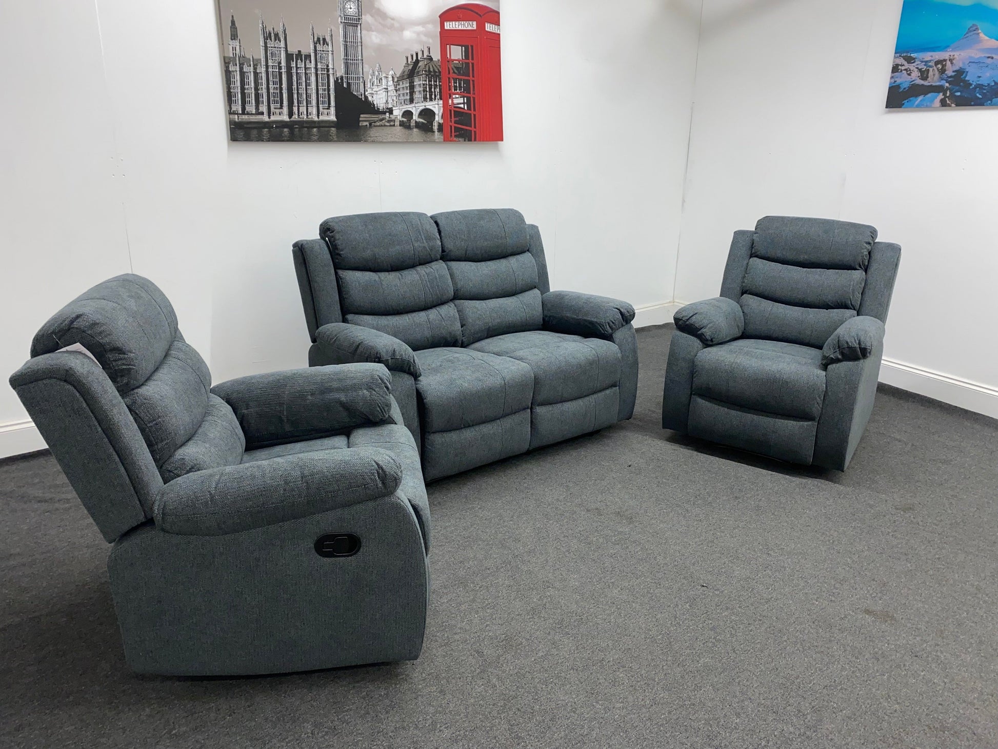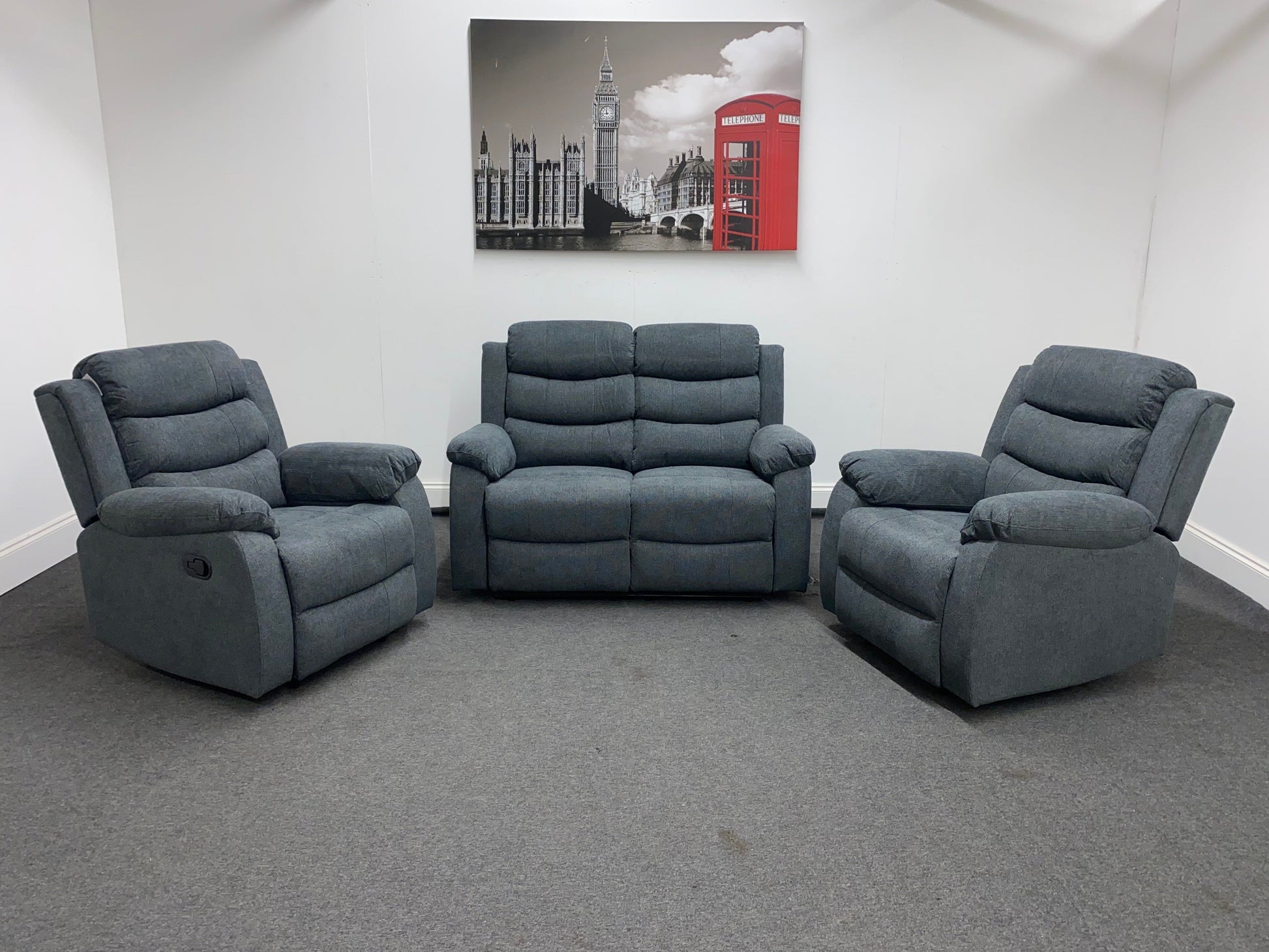 “Lawson" Reclining Charcoal Grey Fabric Sofa Set 3 seater - 190cm 2 seater - 150cm Armchair - 90cm "Create a comfortable living space, this set offers ample seating options for you and your guests. With manual reclining capabilities, you can easily find the perfect position for relaxation. The high-quality fabric provides durability and a stylish touch to your home. Upgrade your living room with this versatile and functional sofa set."