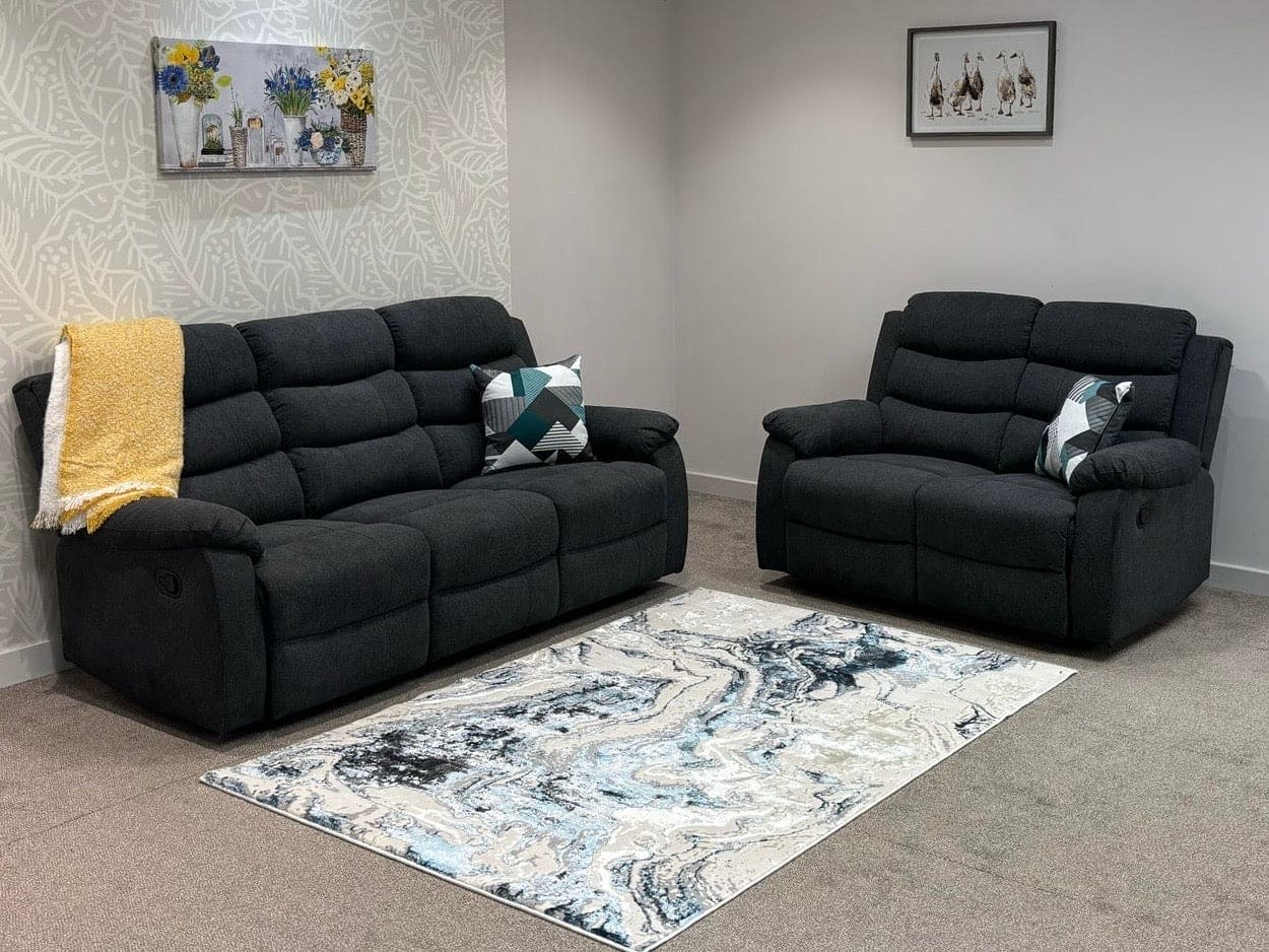 “Lawson" Reclining Charcoal Grey Fabric Sofa Set 3 seater - 190cm 2 seater - 140cm Armchair - 90cm "Create a comfortable living space, this set offers ample seating options for you and your guests. With manual reclining capabilities, you can easily find the perfect position for relaxation. The high-quality fabric provides durability and a stylish touch to your home. Upgrade your living room with this versatile and functional sofa set."