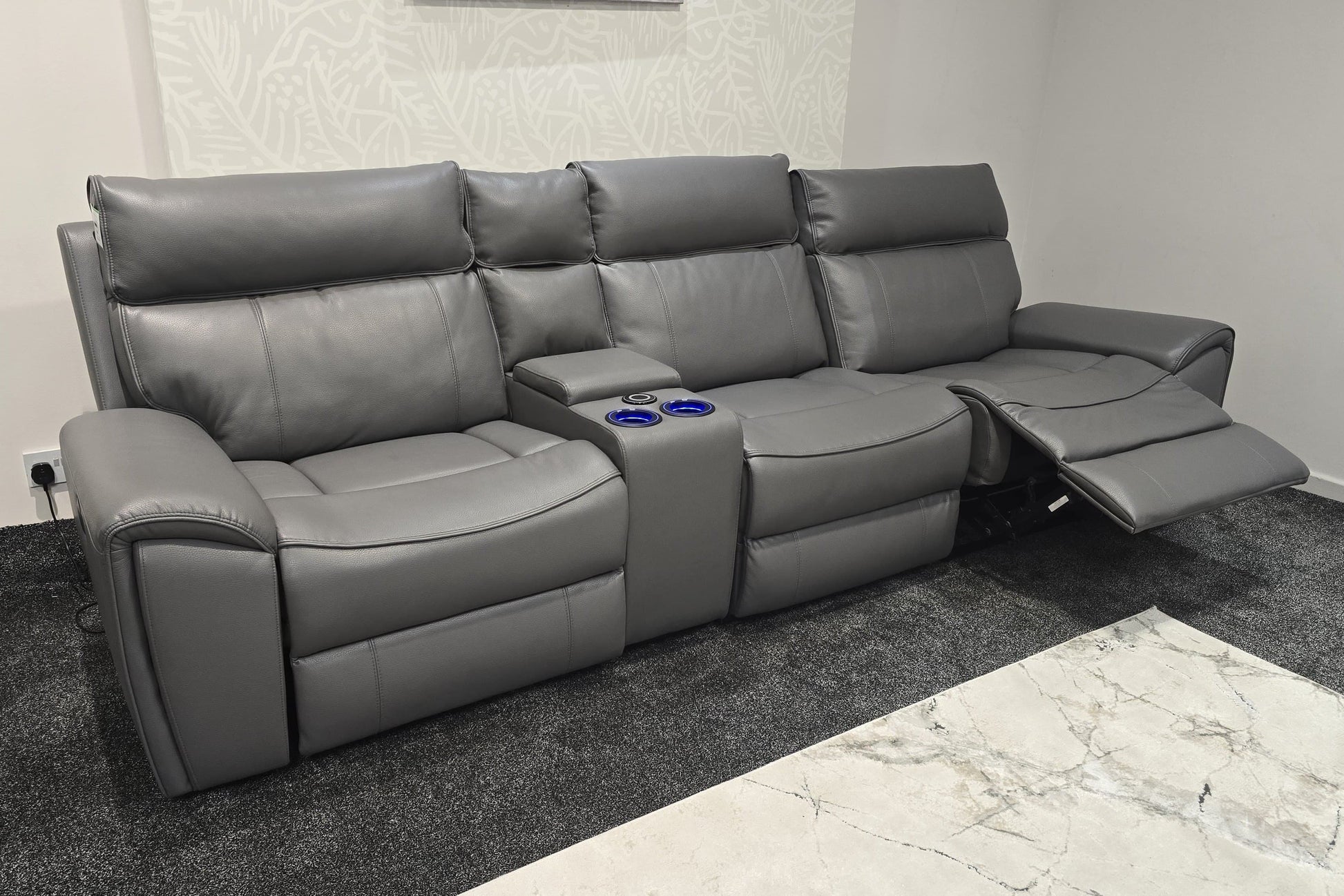 "Ronan" Reversible Cinema 5 Seater Sofa In Milano Grey Leather & With Electric Recliners, Drinks Coolers, Wireless Charging & Storage. Laf + Raf + Armless Tech Console