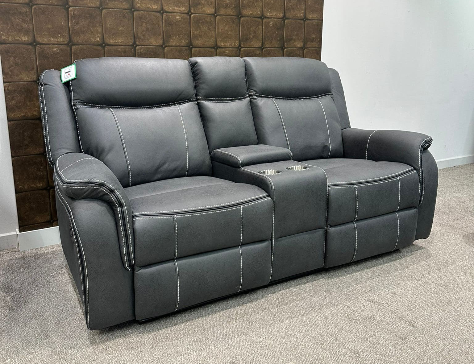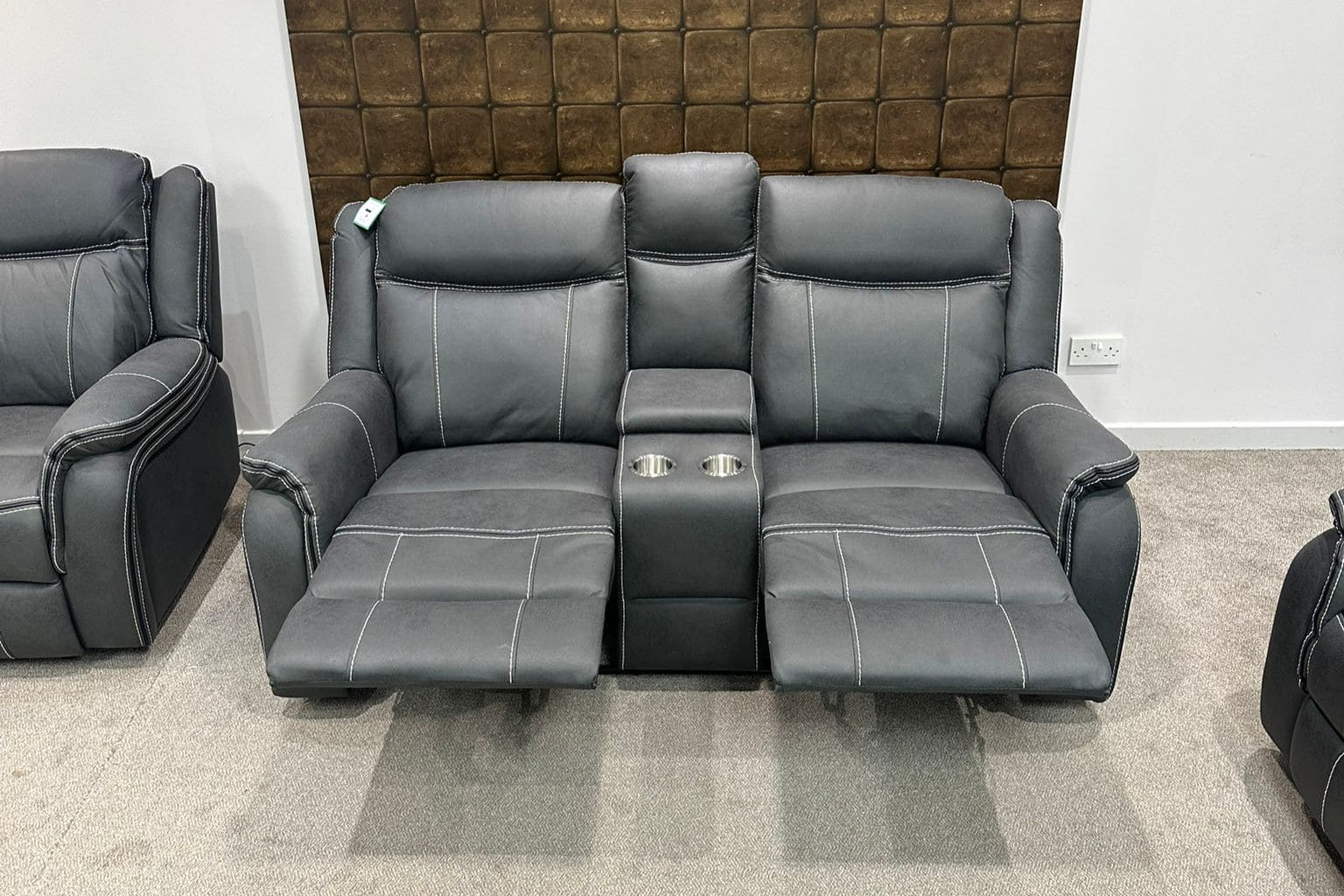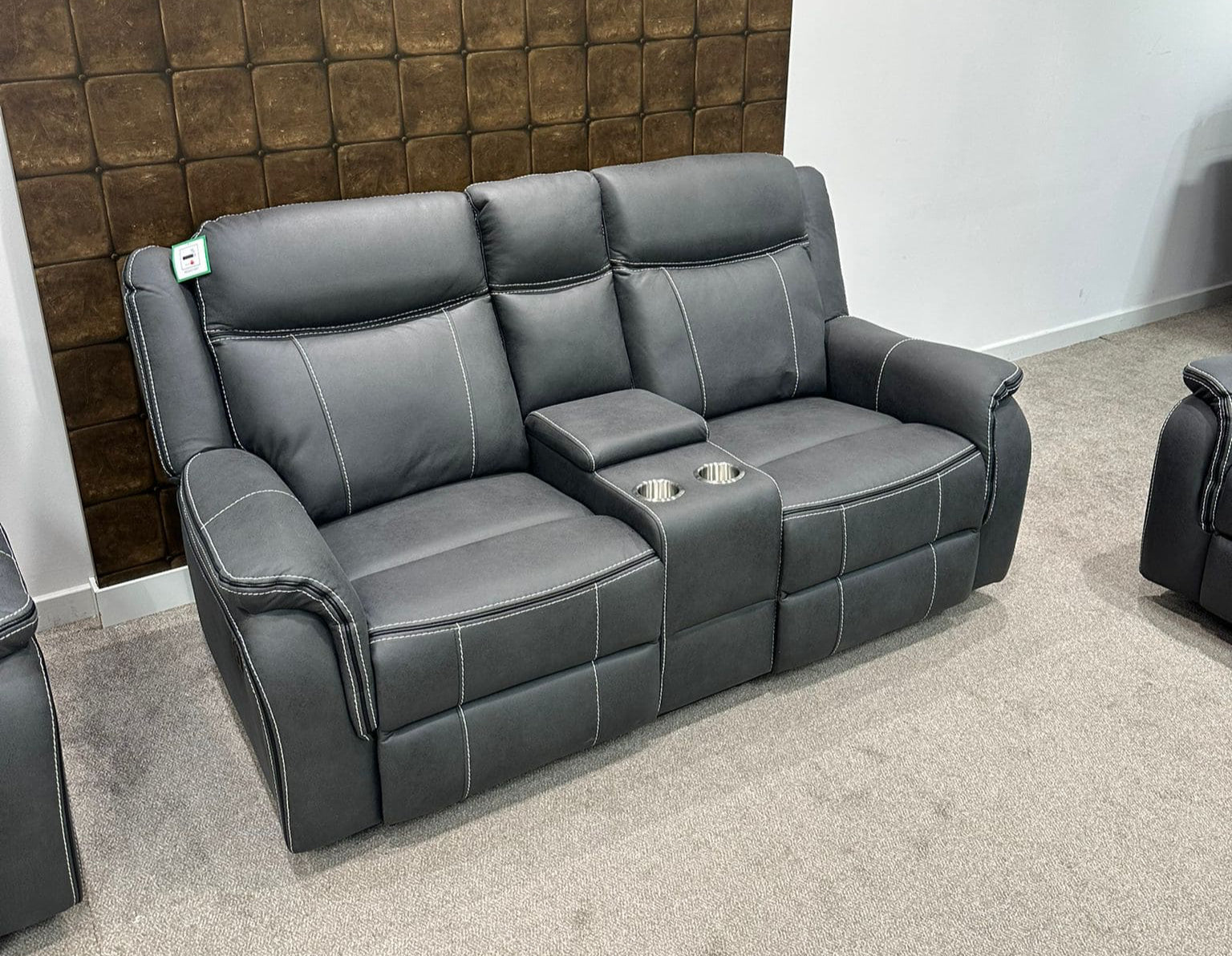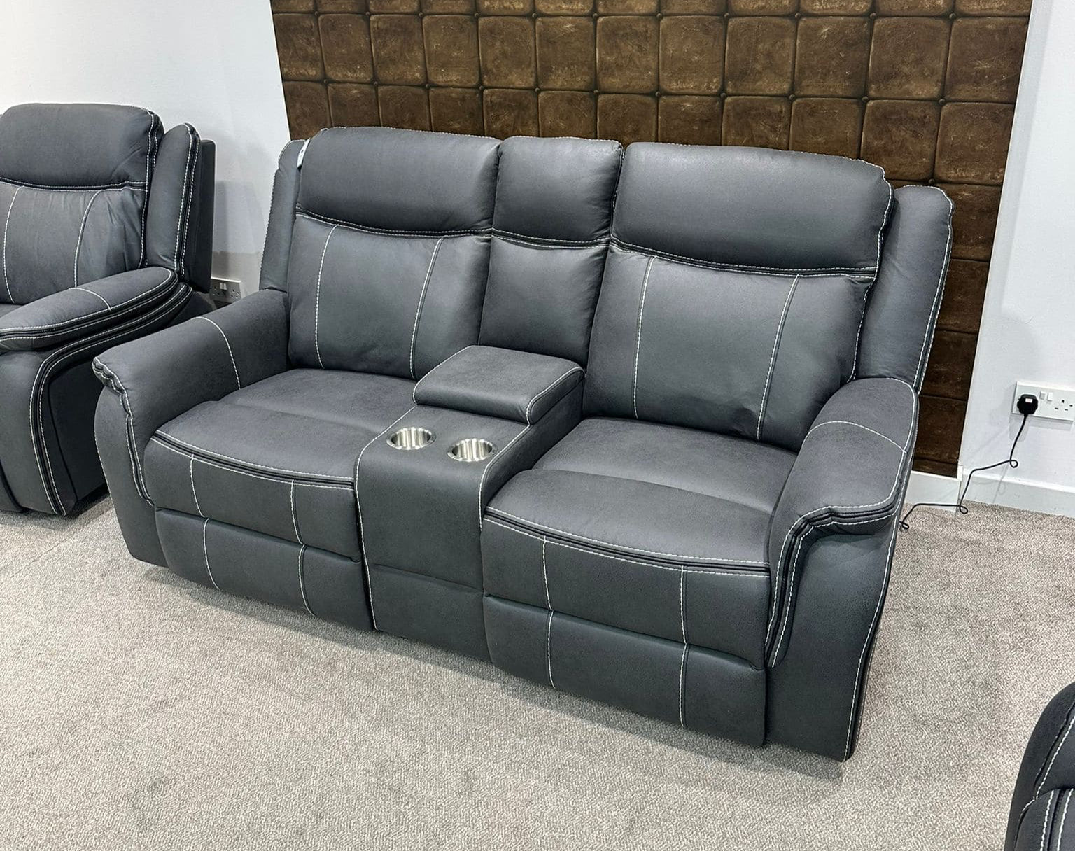 ‘Lewson’ Charcoal Grey Fabric Recliner 3 Seater + 2 Seater Sofa Set + Drinks Tray Table | Couch |