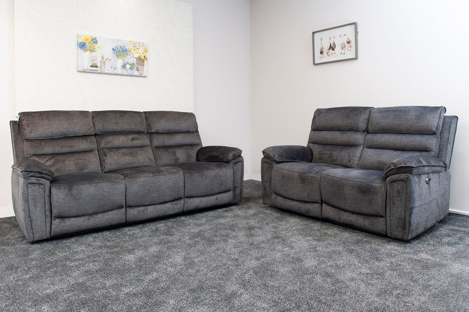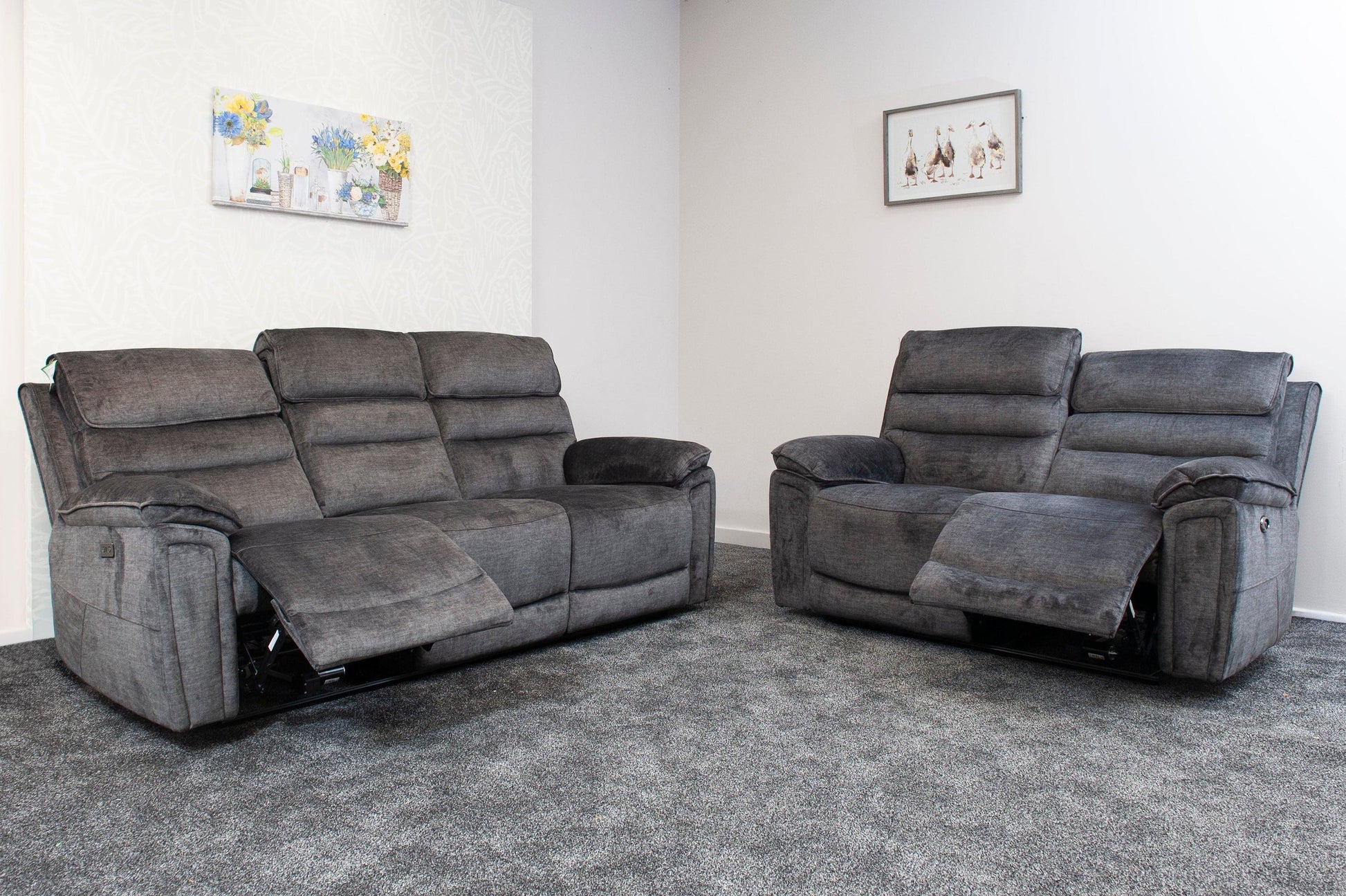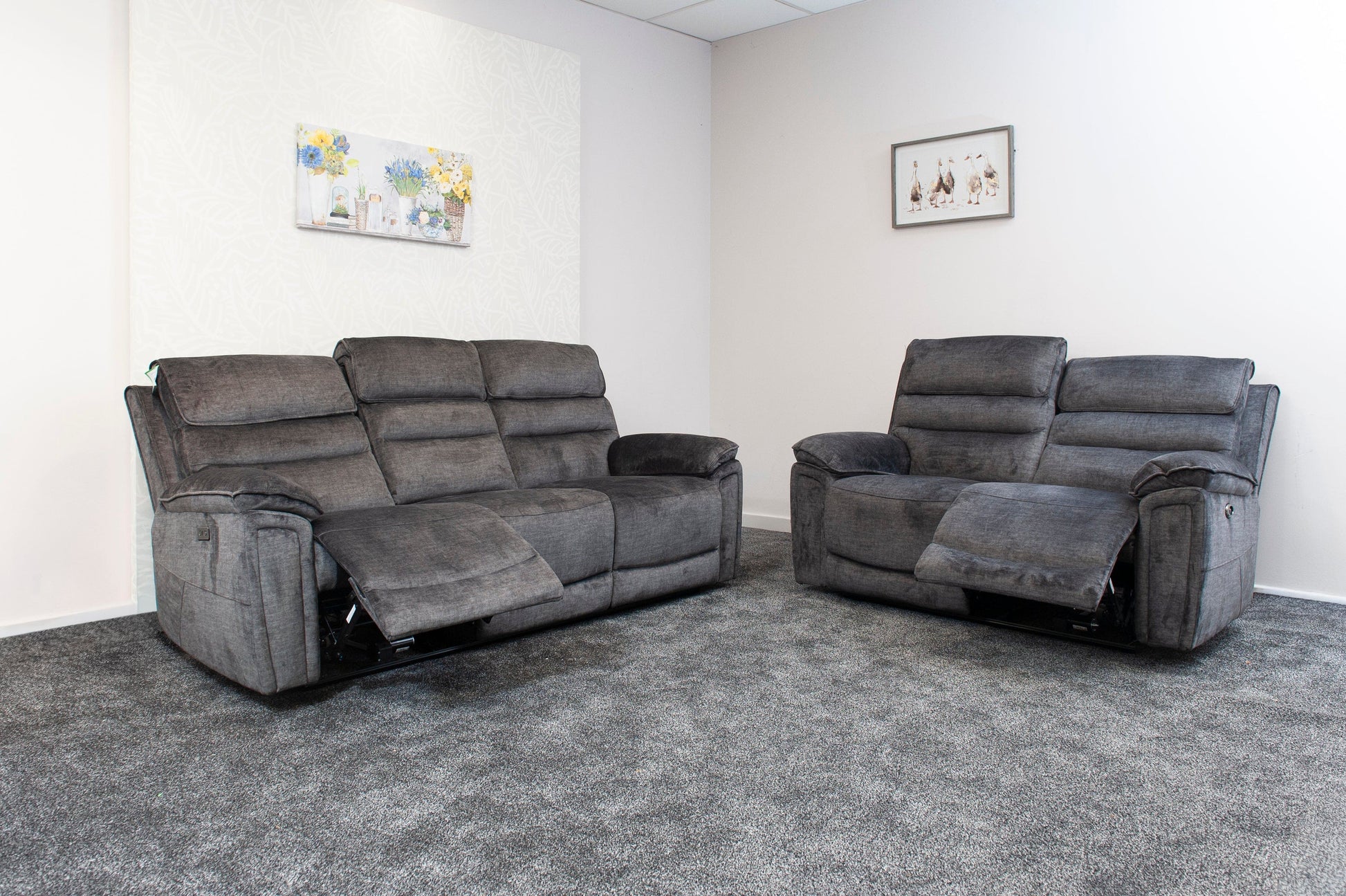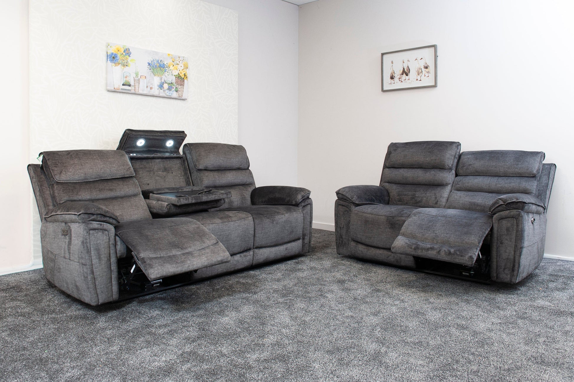 Upgrade your living room with the Electric Reclining Charcoal Grey Fabric Sofa Set.
