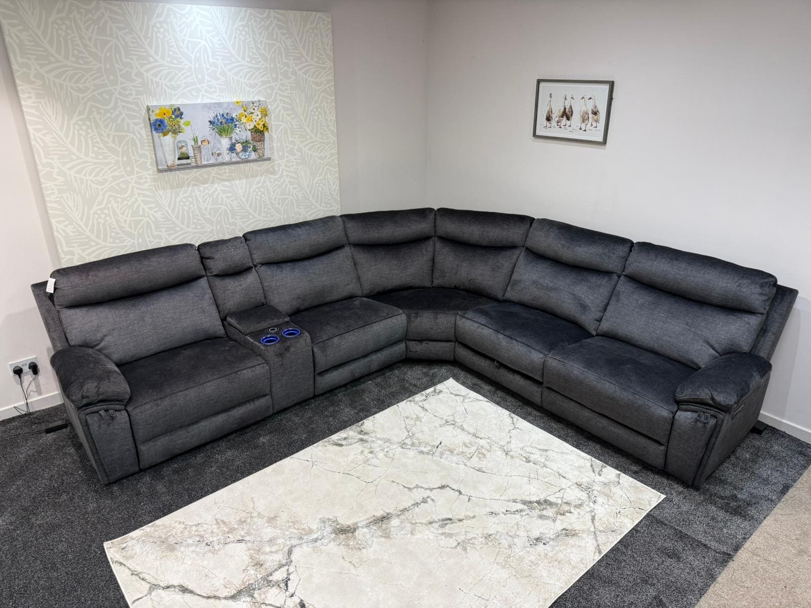 "Xavier" Grey Plush Fabric Power Recliner Corner Sofa With USB Charging Ports, Drinks Cooling Cup Holders Plus Many More Modern Features